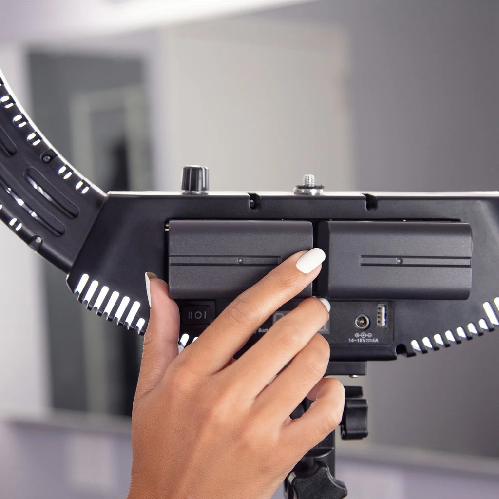 The 18" Bi-Color Ring Light can be powered with the included AC power adapter when you're in the studio or at home. When on location or far from a power outlet, you can utilize the two included NP-F750 lithium-ion batteries to power the ring light for up to 70 minutes at full power.